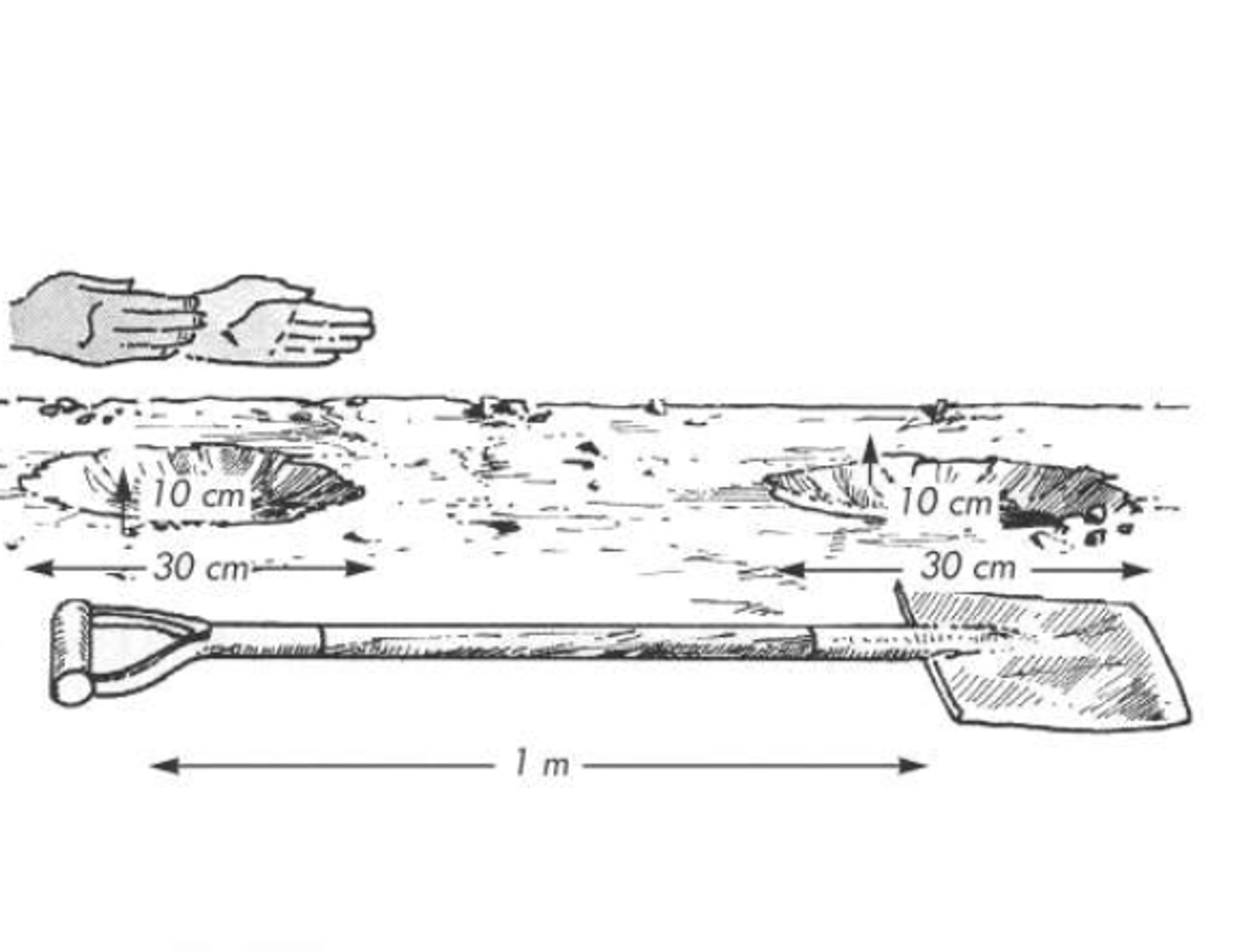 Make your beds 1m wide and 2m long or longer if you have the space. Make a path between each bed which is wide enough for you to walk along. Then you will be able to reach the plants on both sides of the path without damaging them. A spade is 1m long, so you can use your spade to measure the size of the bed. Mark the bed with sticks and string (one stick in each corner).