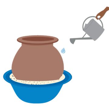 Clay pot coolers cool air through the evaporation of water. The temperature in the cooler will be at least 8°C lower than the maximum daily temperature.