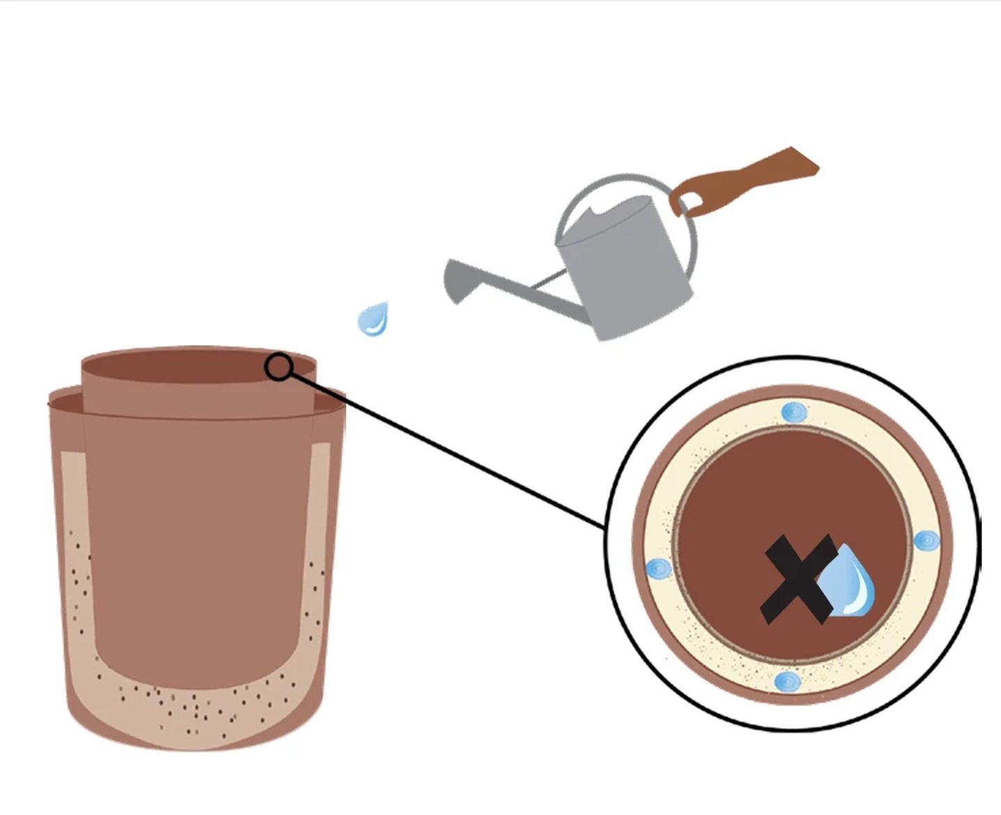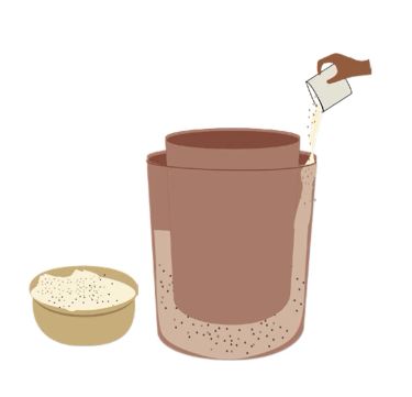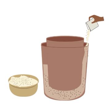 Center the inner pot on the layer of sand inside the outer pot and fill the space between the two pots with additional sand. Make sure the top of the inner pot is at least 2 cm higher than that of the outer pot.