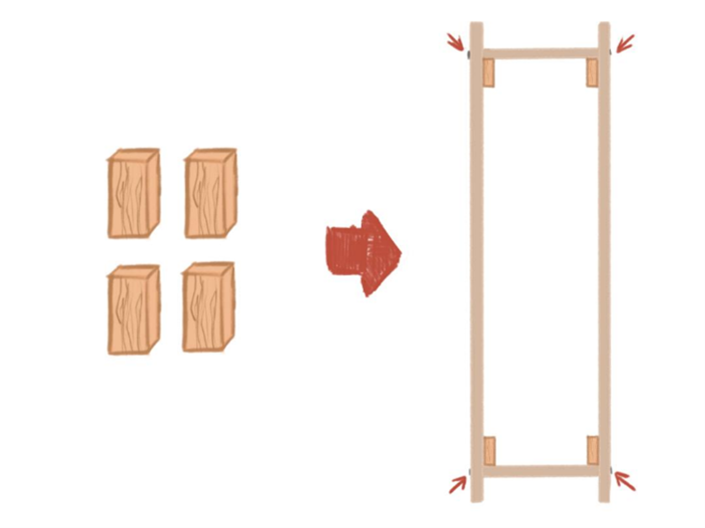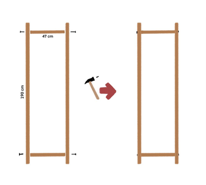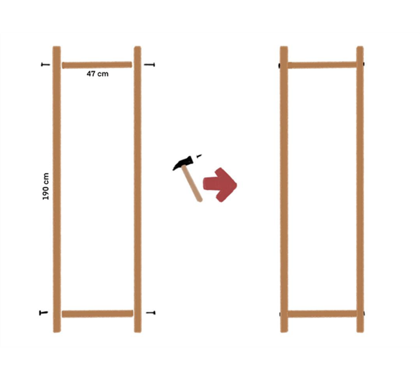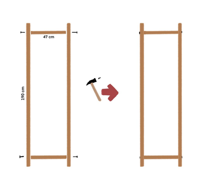Place the the 4 wooden beams together on the ground and connect them with the nails. Use two nails on each side.