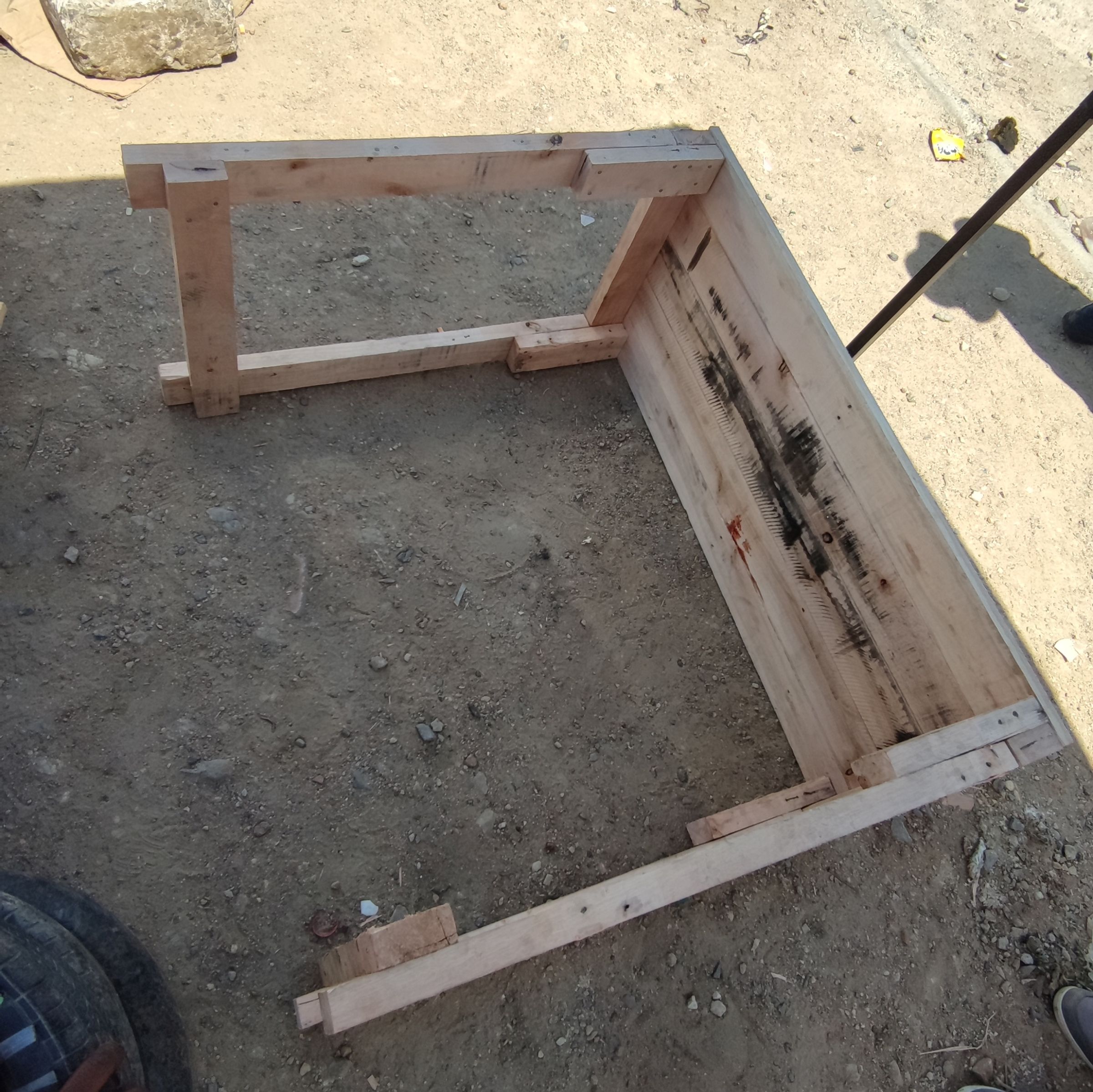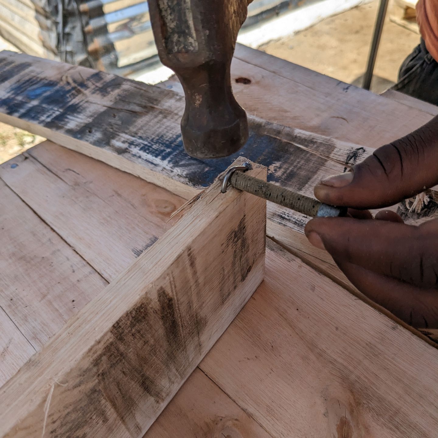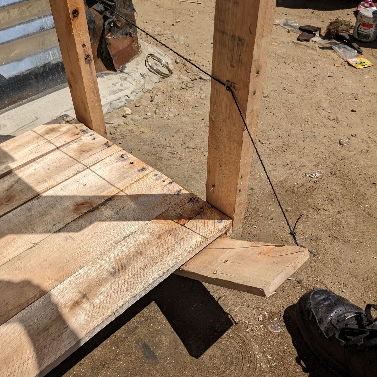 For attaching the long legs, we need a plane underground. We took an extra palette, that we had lying around. Again, rather use more than less nails.