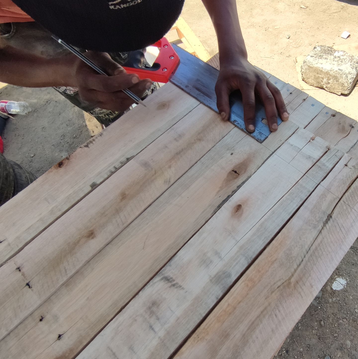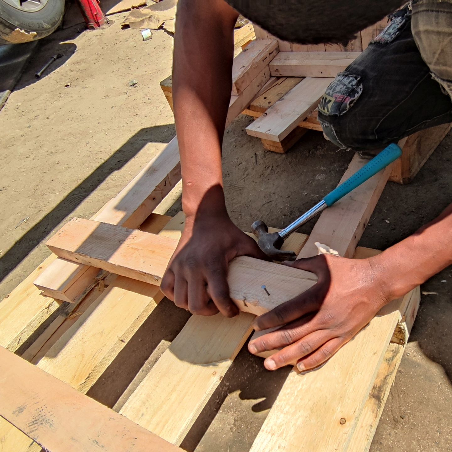 Take a hammer or a wreck bar to take apart both palettes. Our palettes were square 1m x 1m, so we ended up with 6 strong beams of 100cm length (8cm x 4cm diameter) and 18 boards of 100cm x 10cm.