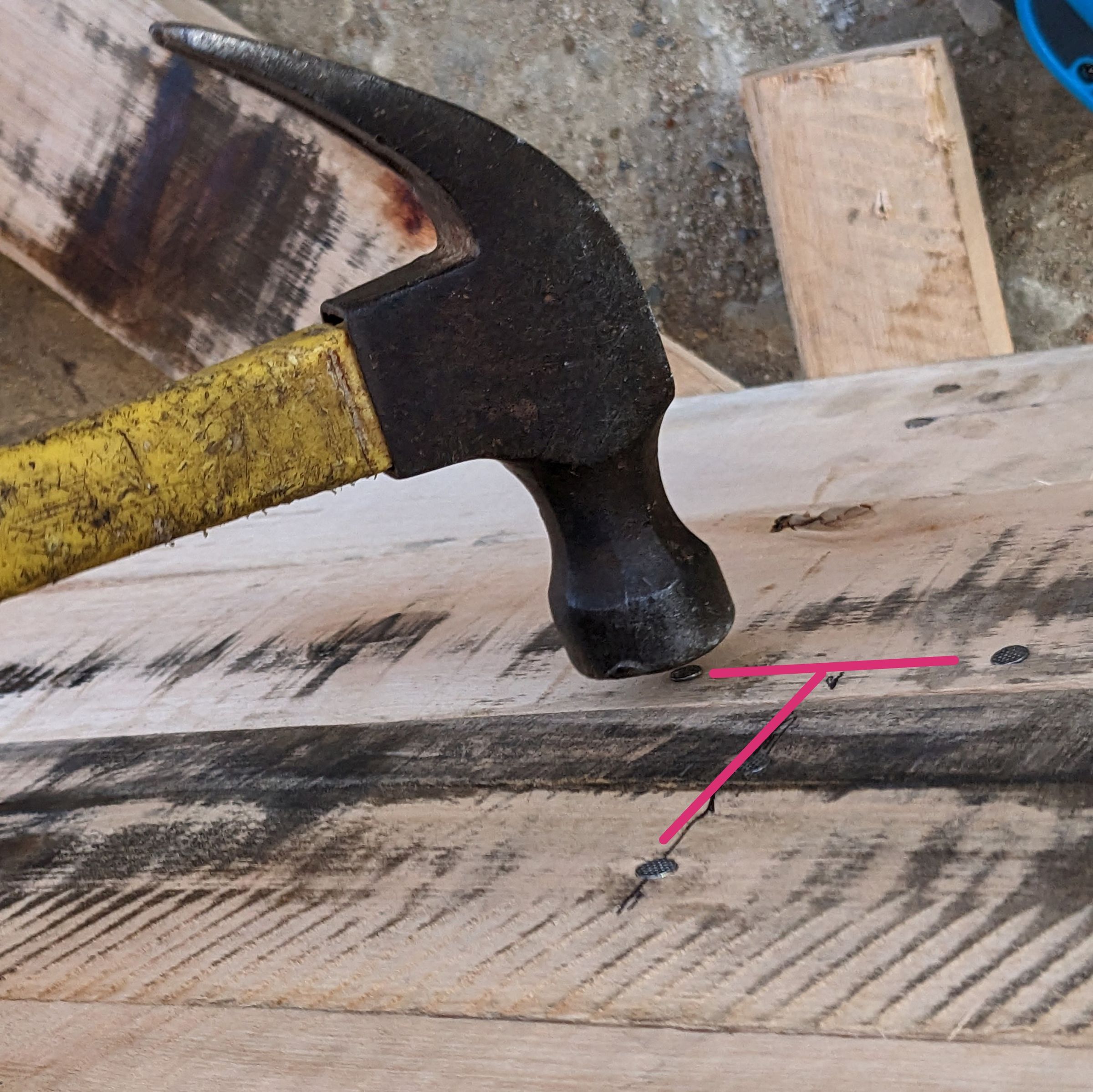 The boards are nailed onto the cross-beams. For nailing them, it is good to put some offcuts under the crossbeam, so you do not loosen the beams again.