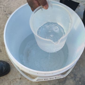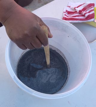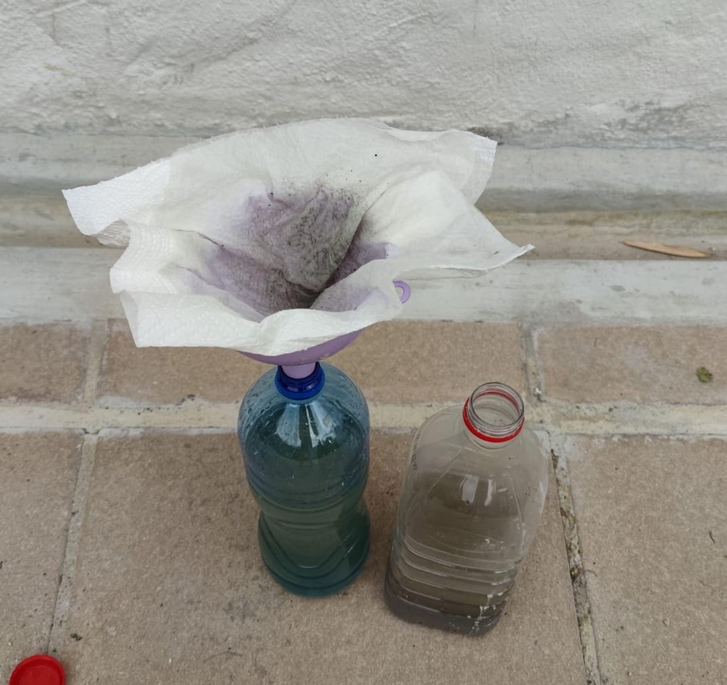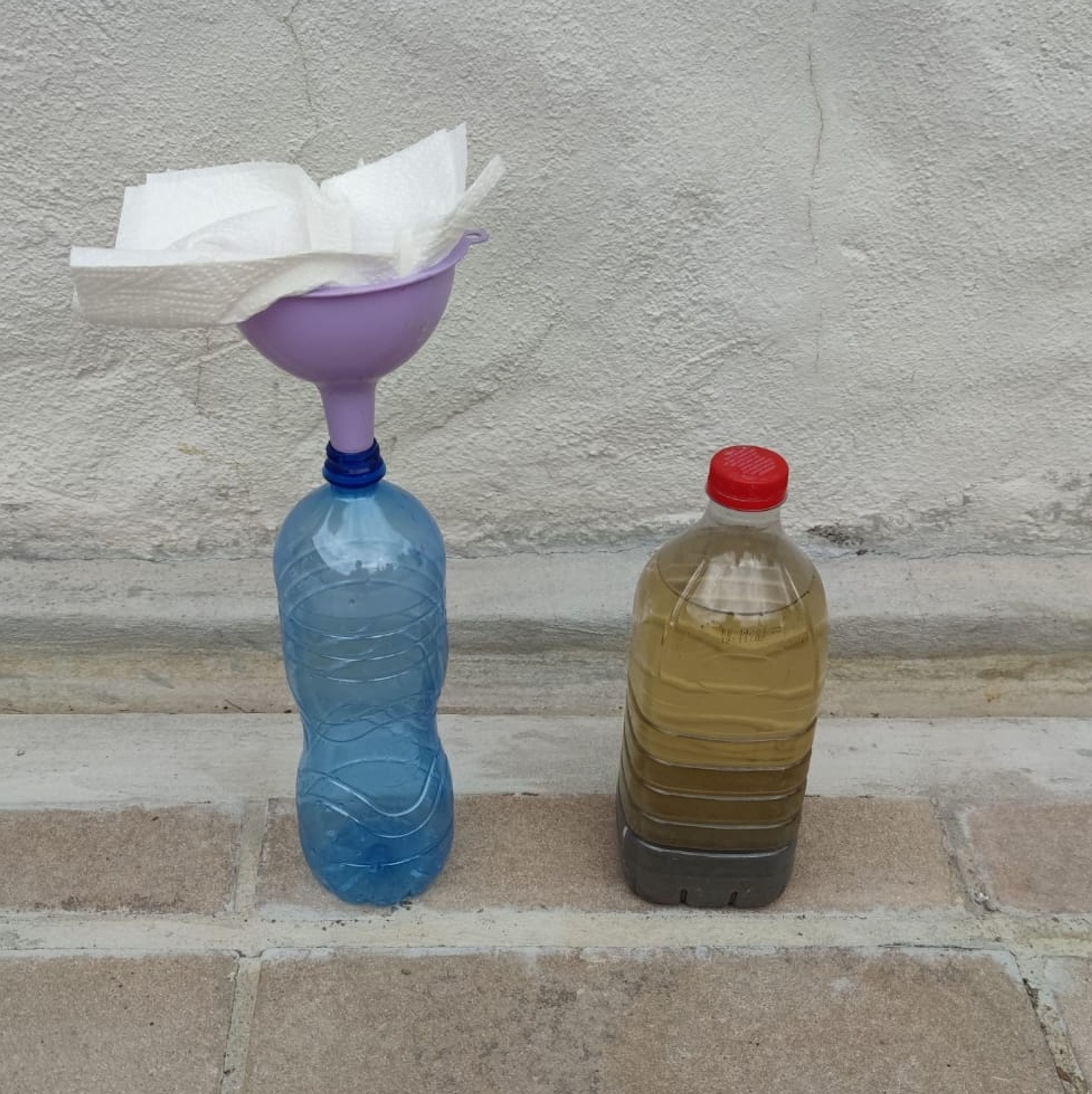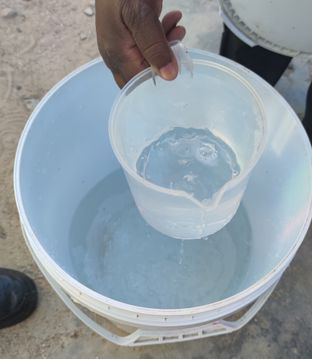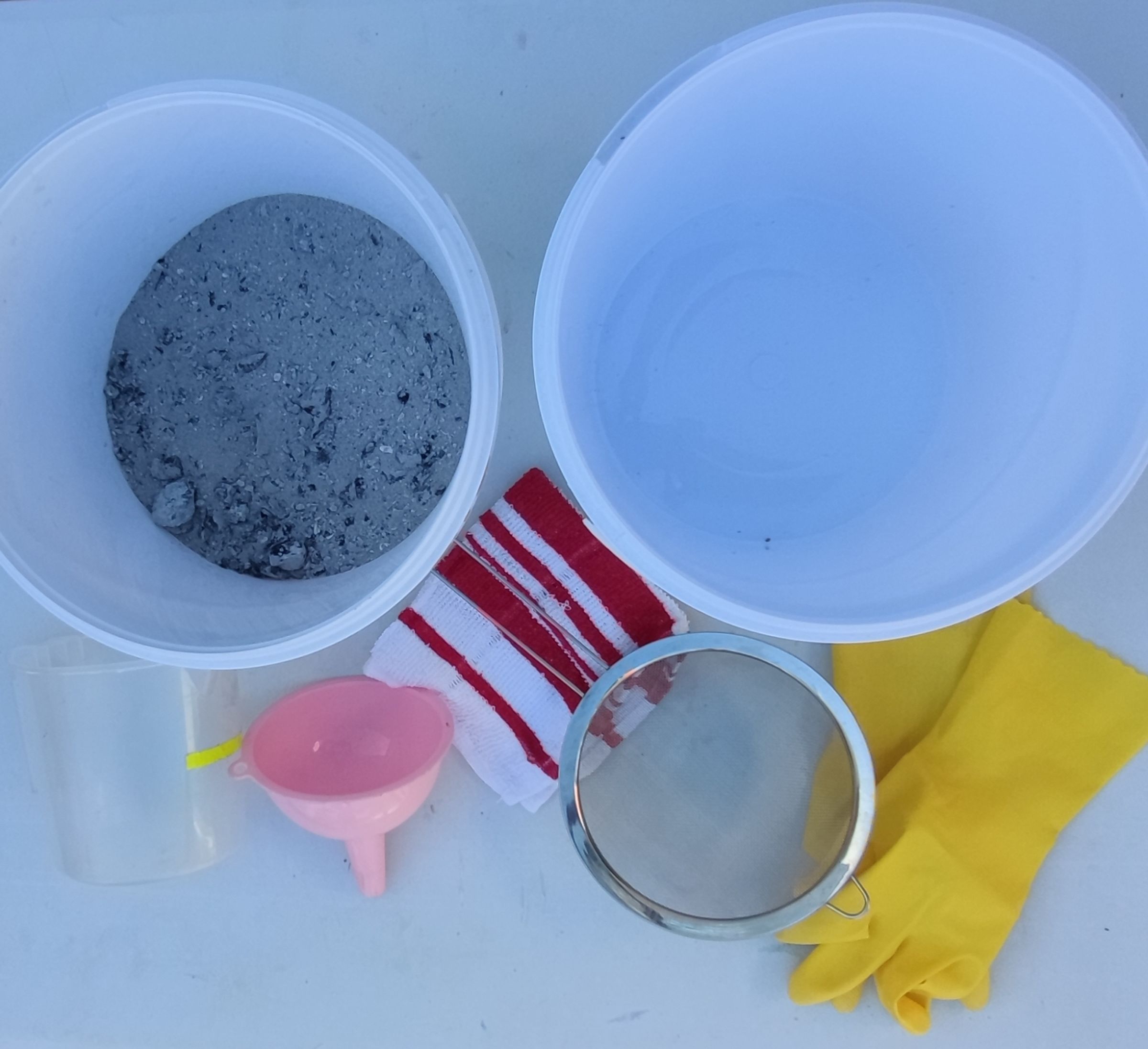 We put the ash-water mixture in a bottle so you can see how it settles. Let all the ash settle to the bottom of the bucket/bottle before you filter it.