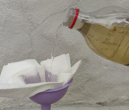 Use the funnel and a double folded kitchen towel or a paper coffee filter for this. Fabrics could also be used but must be dense.