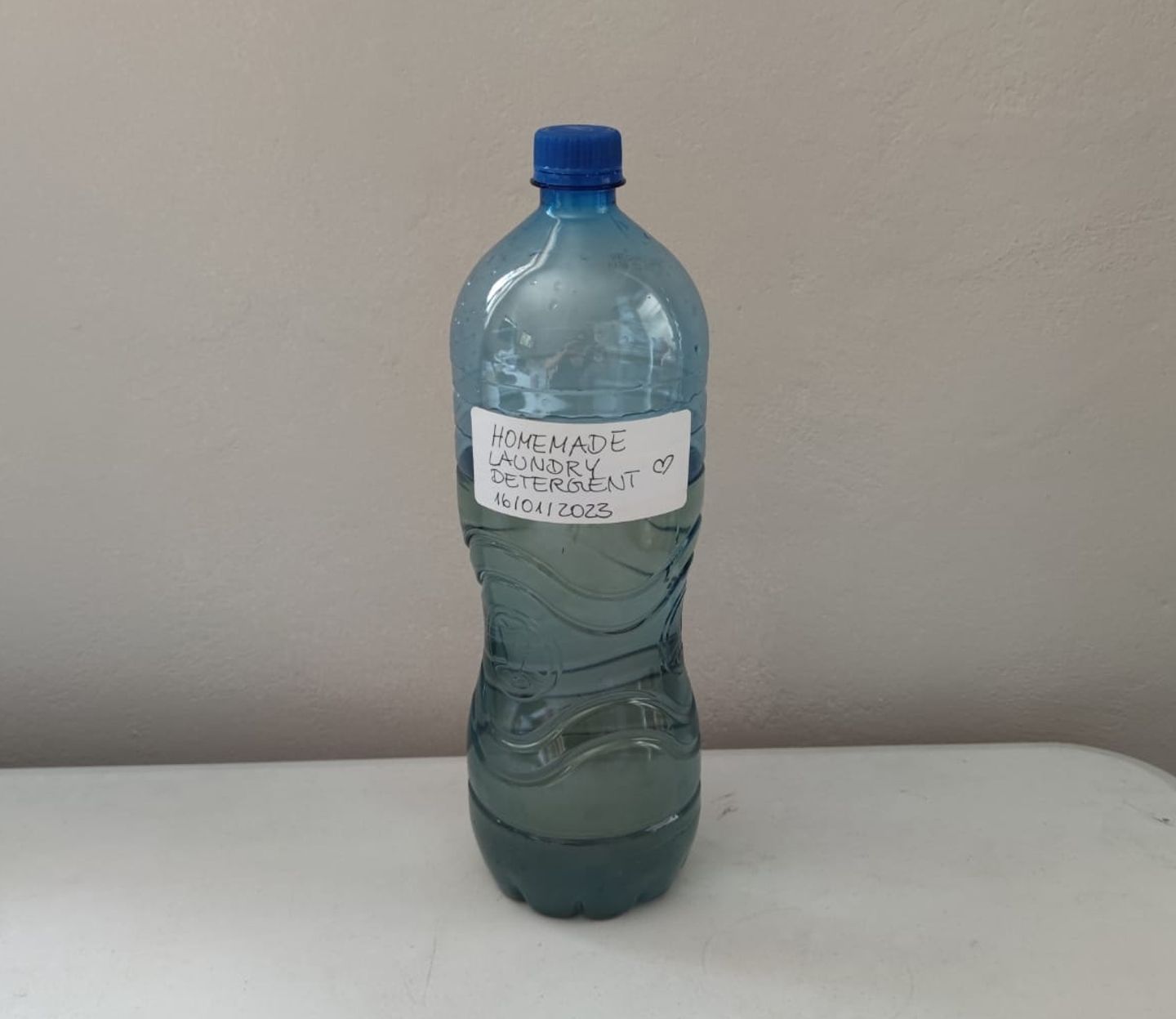 The detergent is transparent and slightly yellow. There are no black pieces in it anymore. Label the bottle with today’s date.