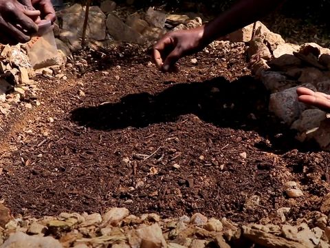 For security, you can use cut up thorn bush and put it in your vegetable beds to keep chicken, dogs, and cats away from digging out your vegetables. Try and use whatever materials are available and appropriate to protect your garden from animals and the sun.