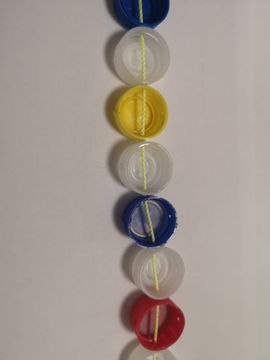 Warm up the end of a 30cm long cord with a candle. Cut off the heated part and tie a knot at the newly cut end. Then, thread the cord through seven bottle caps to create the first row. To keep the caps in place, tie another tight knot at the end of the row. If the cord doesn’t go through the holes easily, heat the beginning of the cord with the candle flame. This will make it smoother to pull the cord through. Just be careful when using the candle!