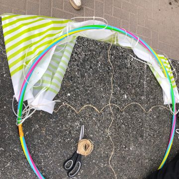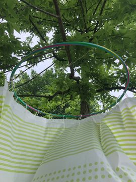 To hang the cabin you must first attach at least 2 strings to the Hola Hoop so that they cross in the middle. Tie the ends to the hoop.