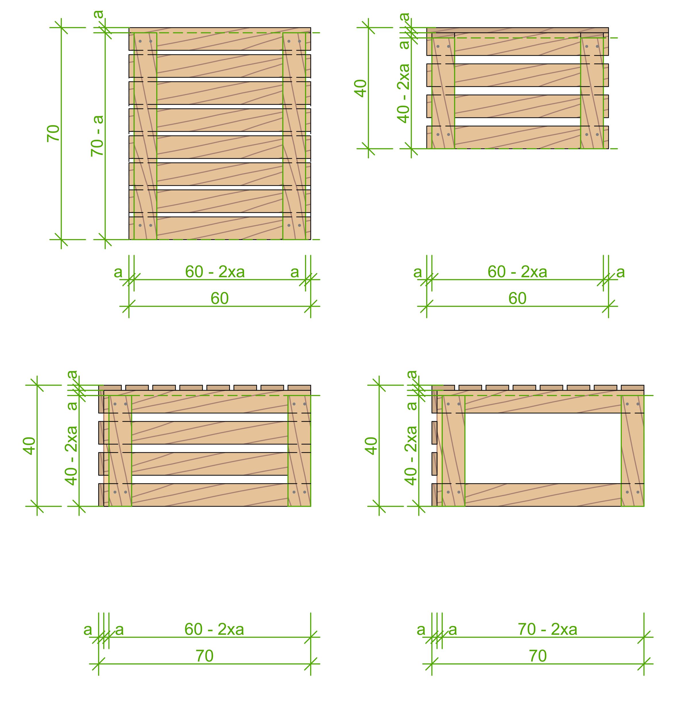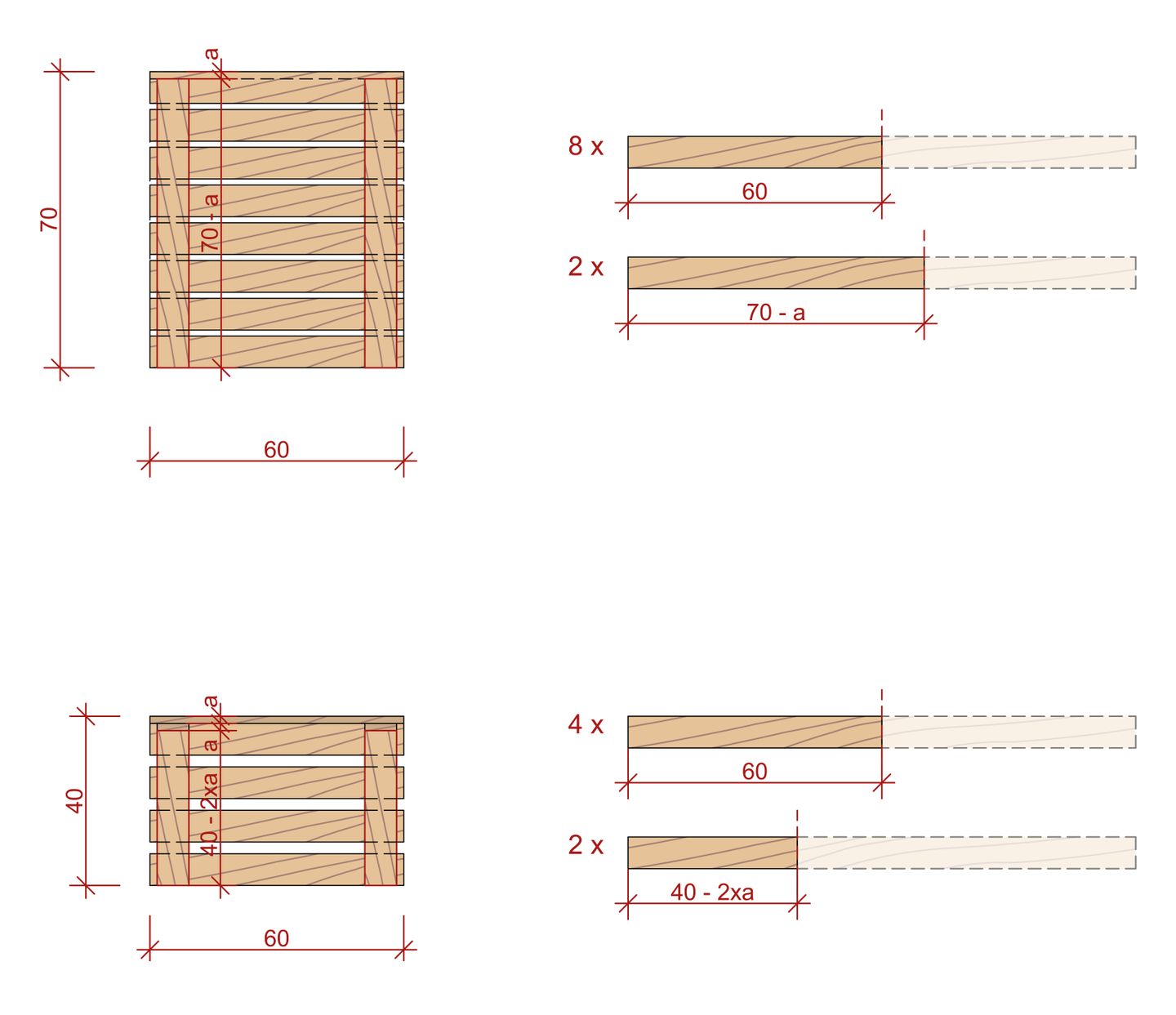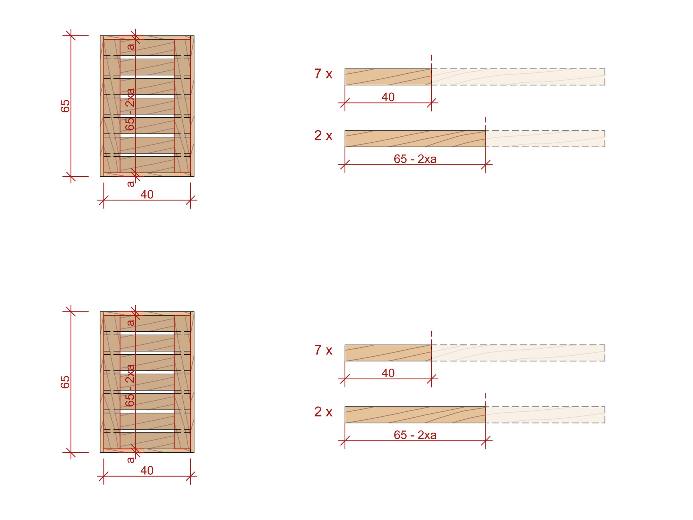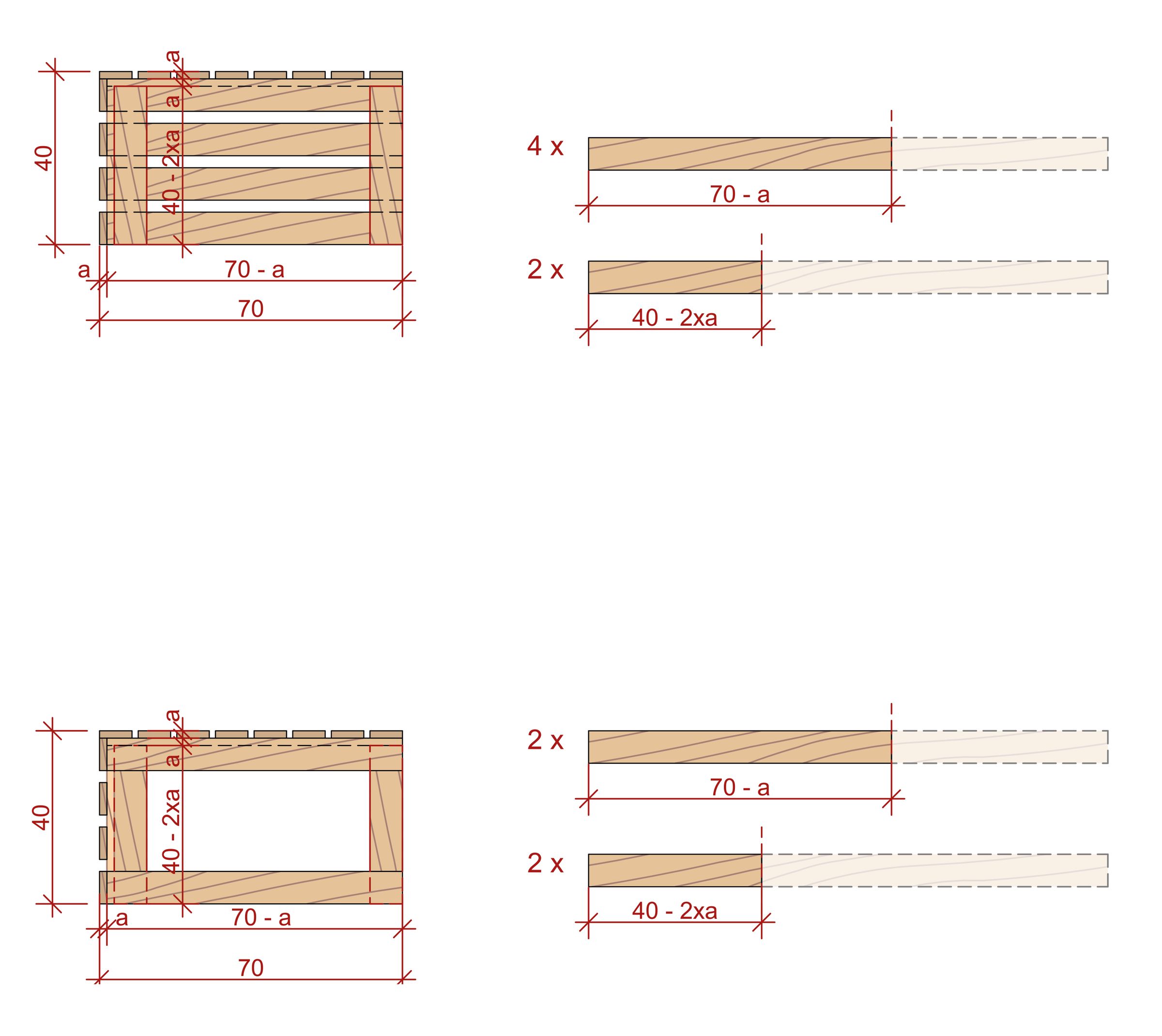 For the short side of the table measure the pieces shown on the bottom right side of the picture: 2 x (70 cm - a) 2 x (40 cm -2xa) a is the thickness of your pallet wood.