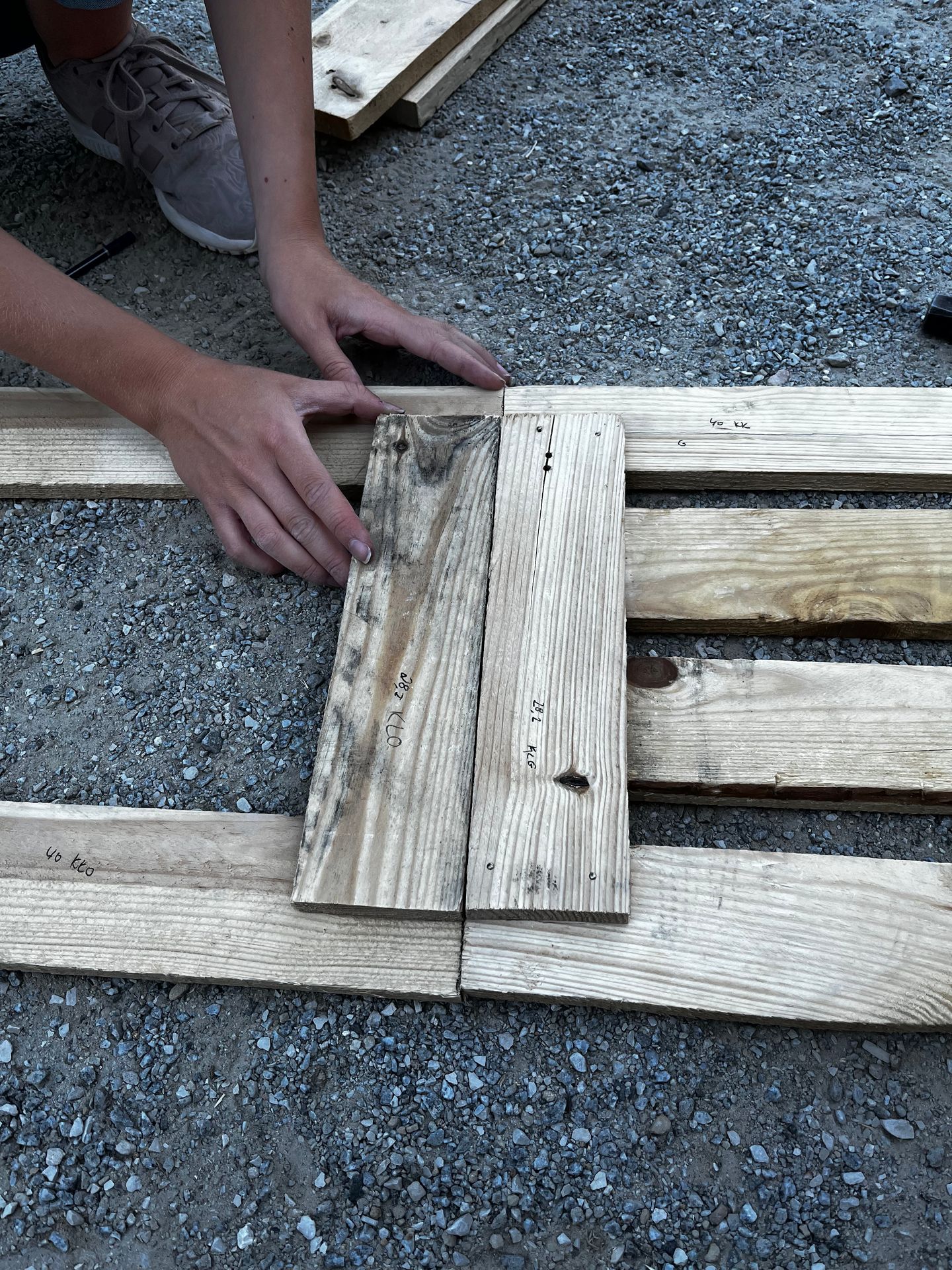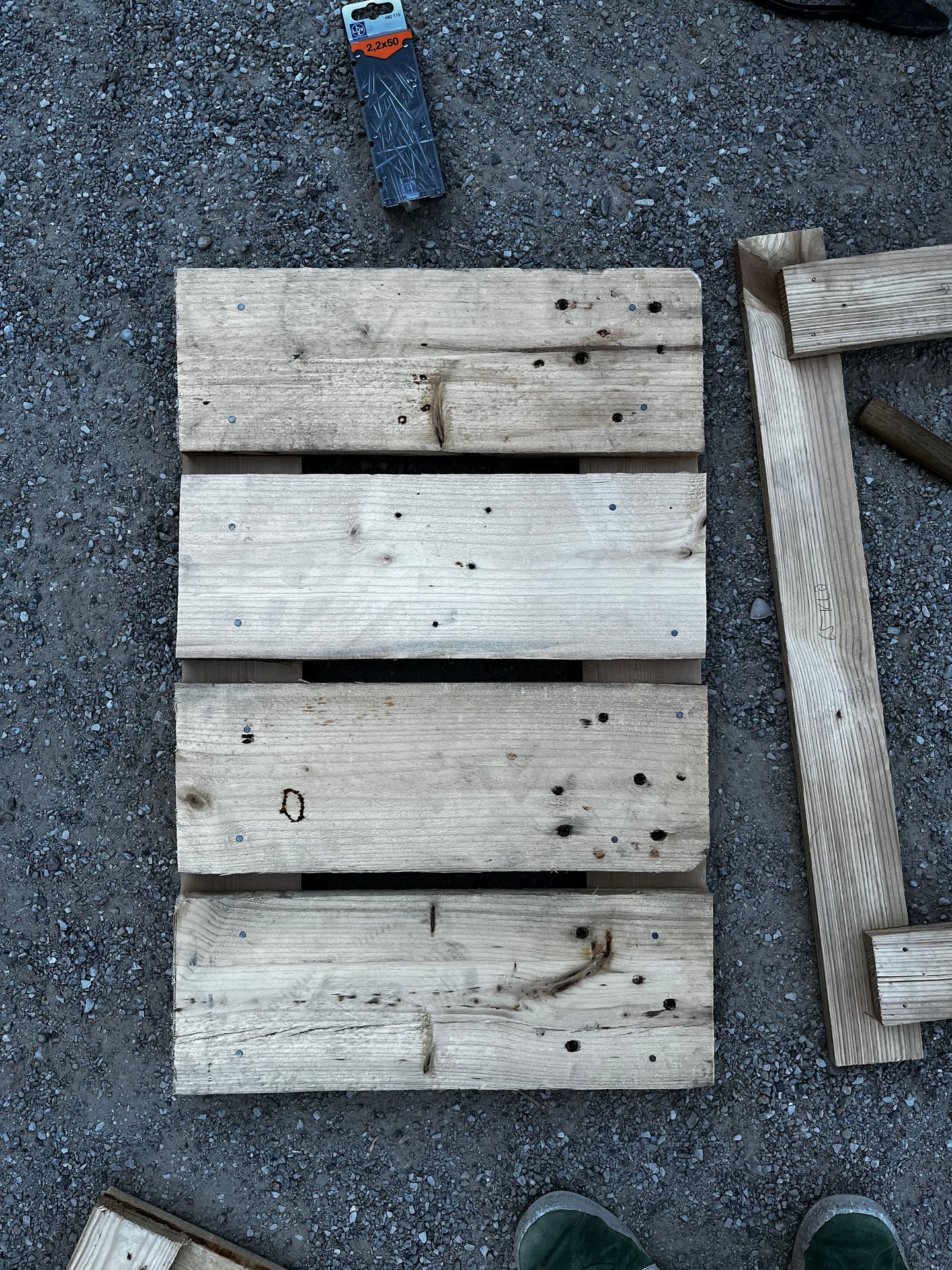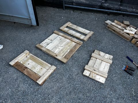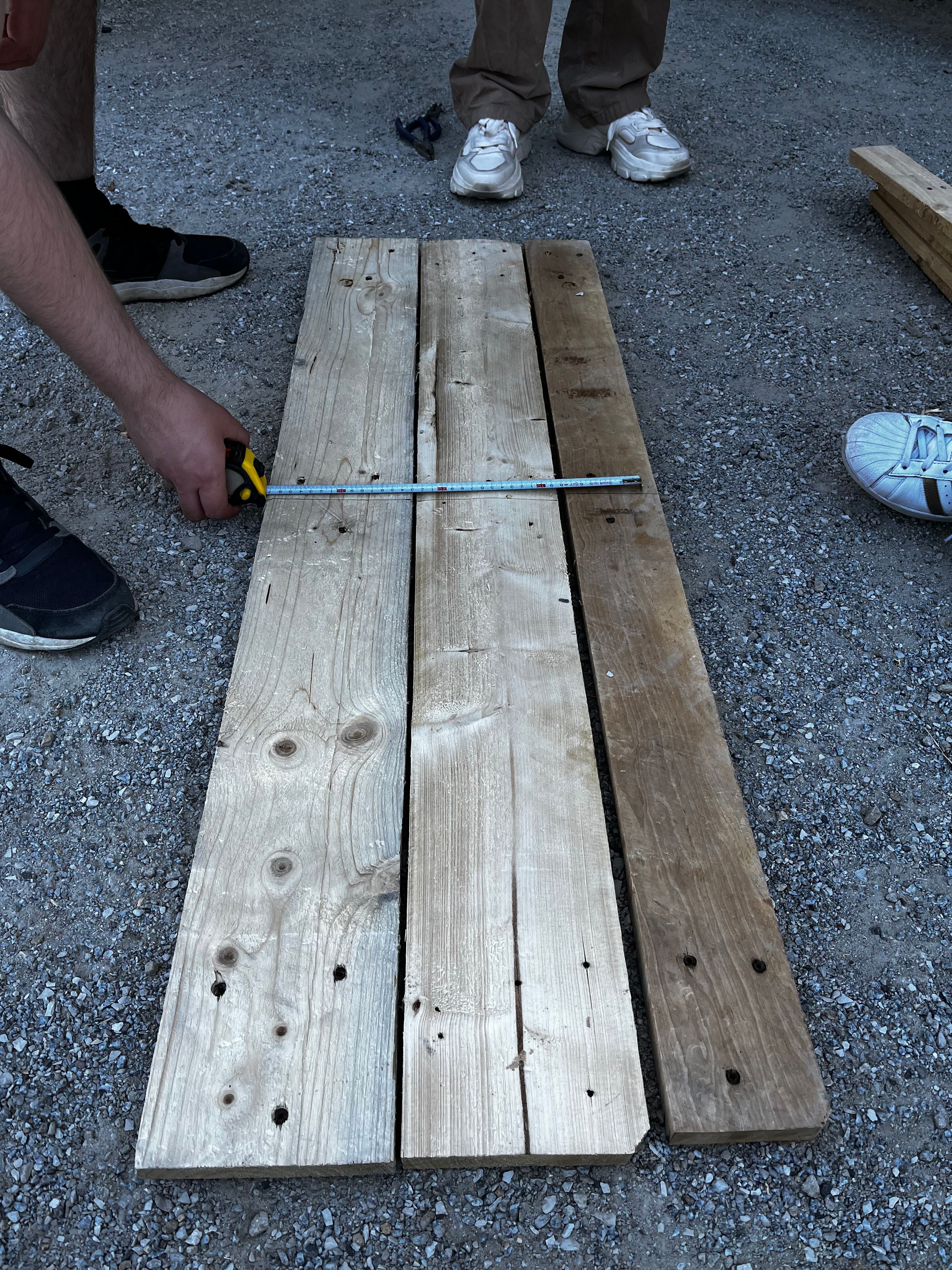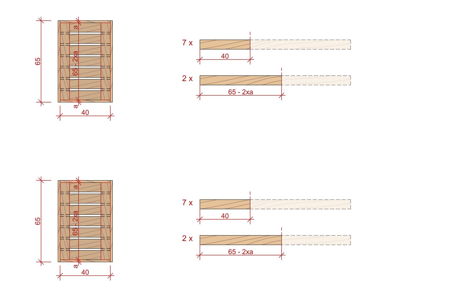 For the short side of the table measure the pieces shown on the bottom right side of the picture: 2 x (70 cm - a) 2 x (40 cm -2xa) a is the thickness of your pallet wood.