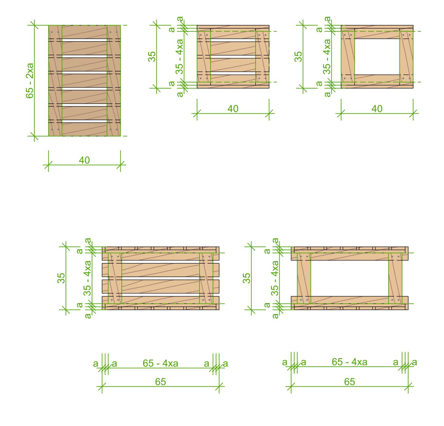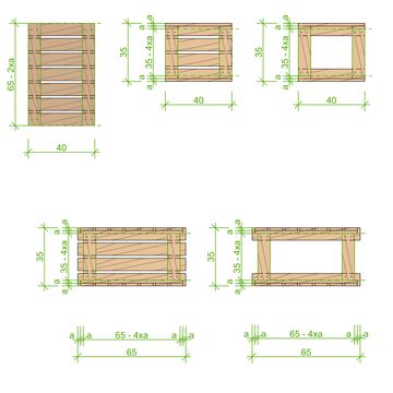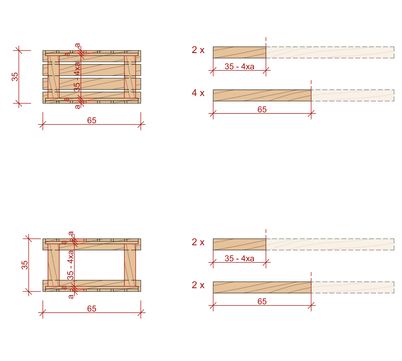 Take the dimensions from the following drawings and measure and mark step by step the different sizes on the wood. Label them with some letters or numbers, so that you have a better overview which piece of wood is for which part of the furniture. This makes it much easier to put all things together in the end.
