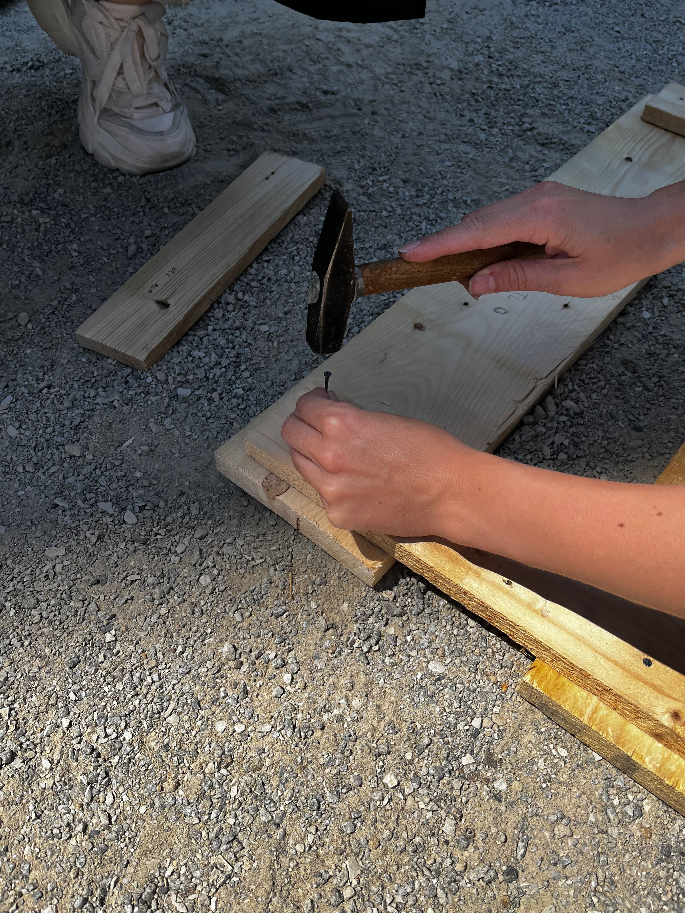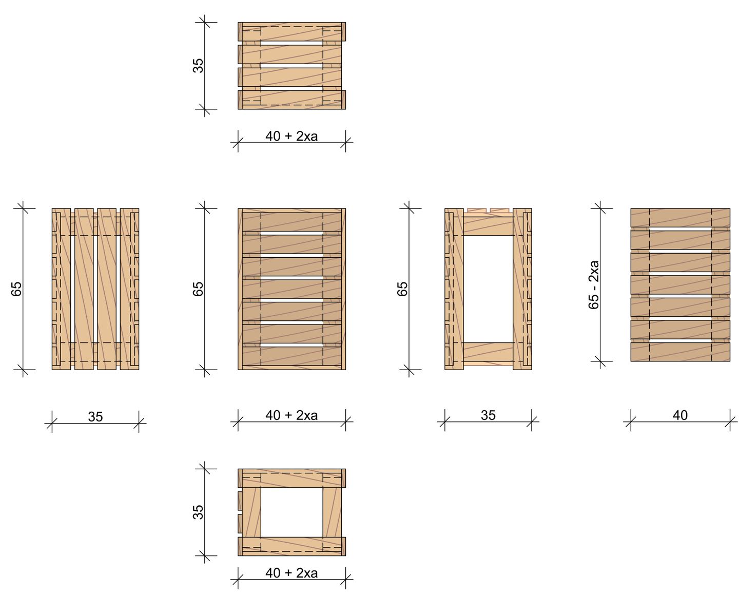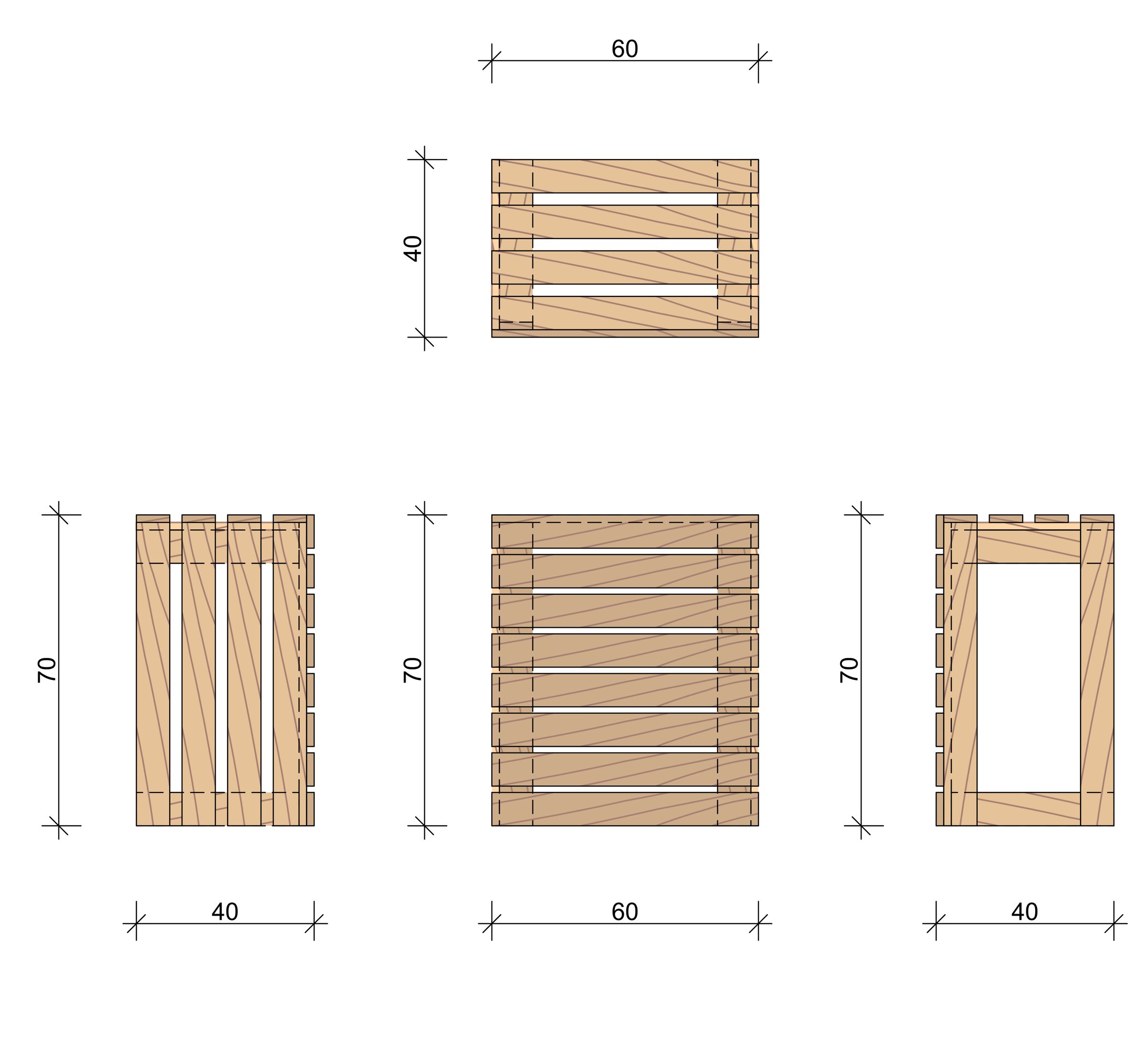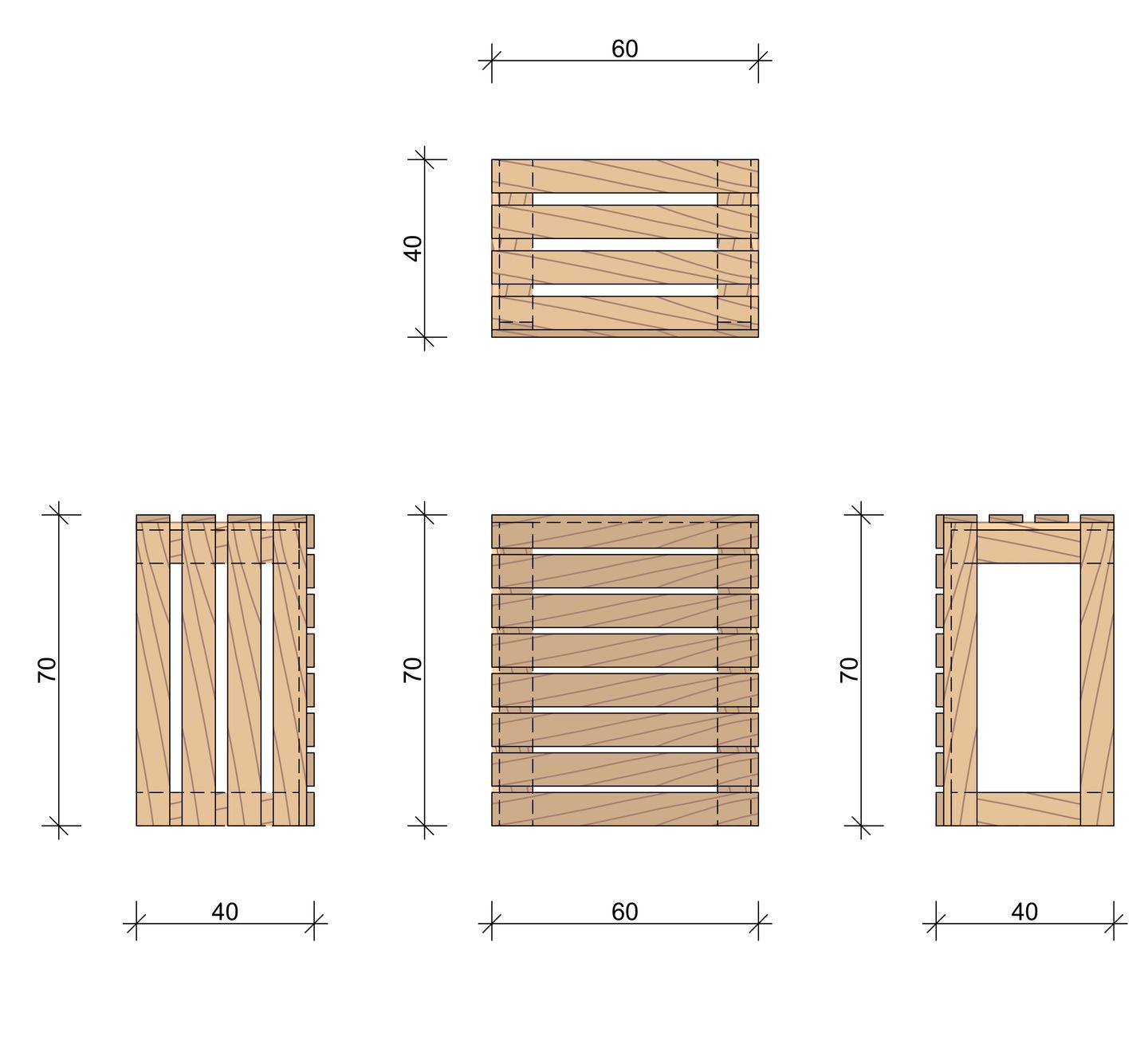The storage box is very similar to the table. Take the drawing, the nails and your hammer and connect the wood pieces. The drawing shows you all the information, the lengths and where you have to consider overhangs.