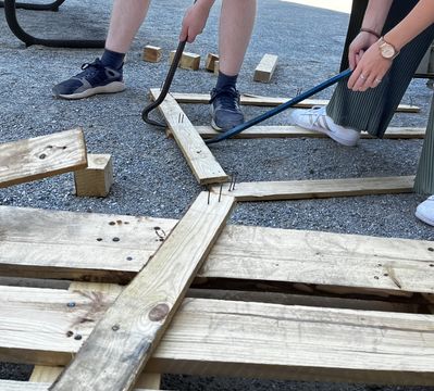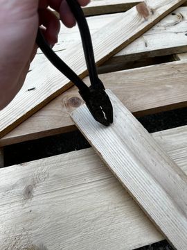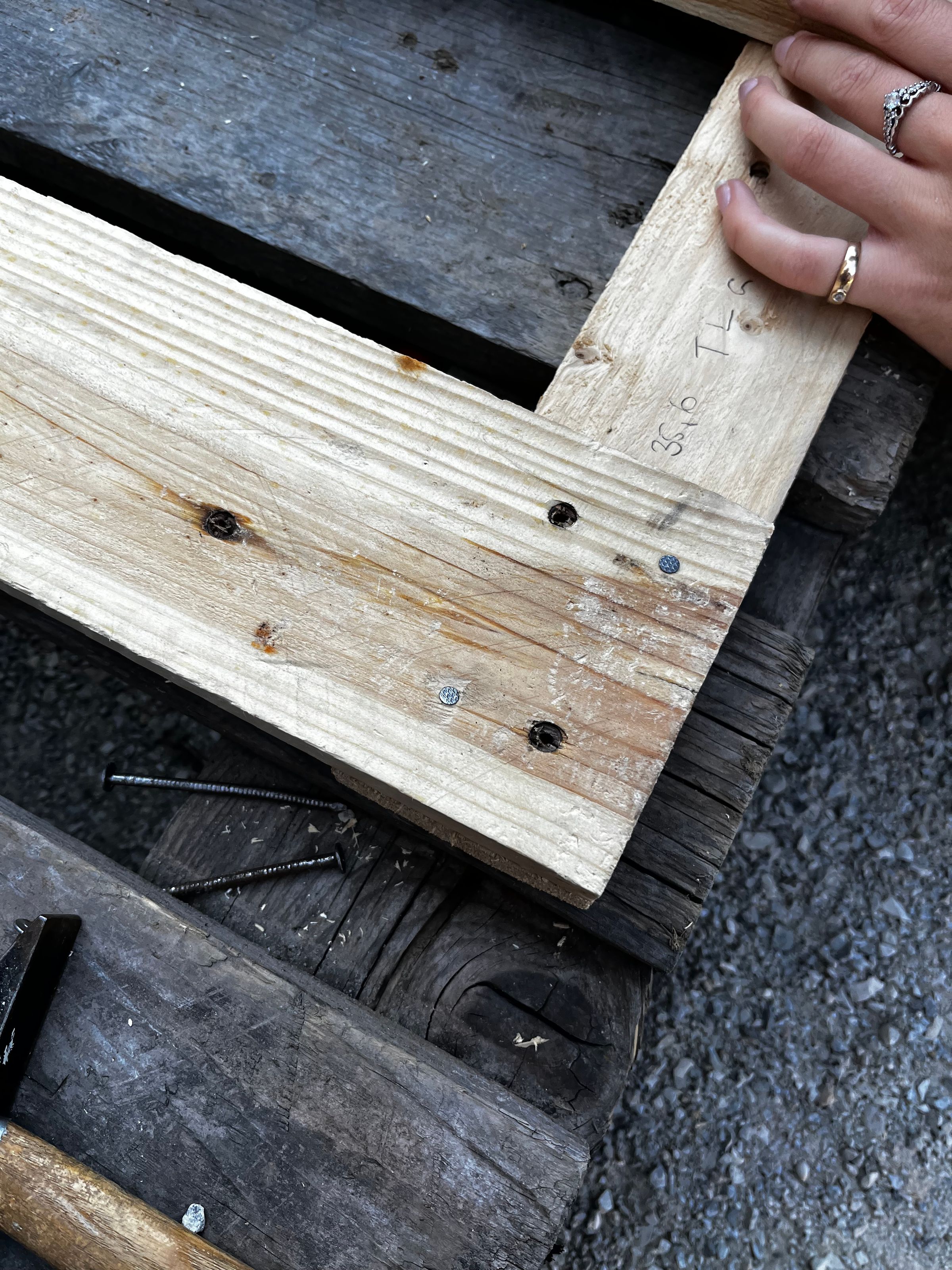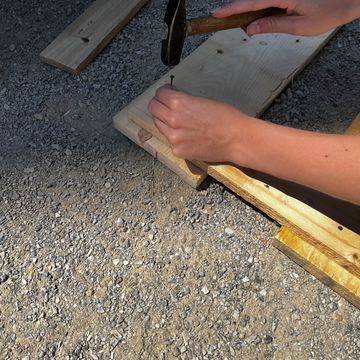 Hit the nails with a hammer into the wood pieces. The drawing shows you how you must connect them. Watch your fingers and pay attention on the overhangs at some places. As you can see in the next photo you can use another piece of wood to measure the overhangs.
