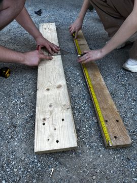 Cut the wood along the marks into pieces with a saw. After you cut all the pieces, place them how they should be connected. Use the pictures above as a guide.