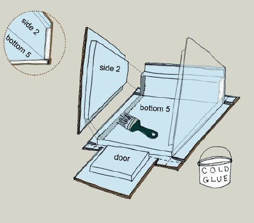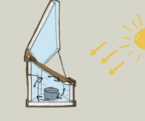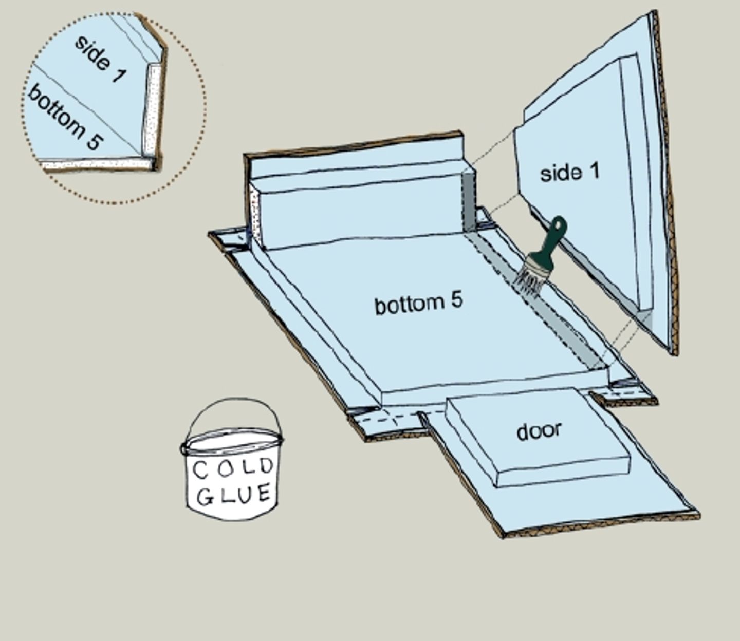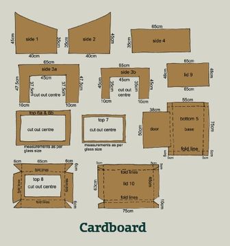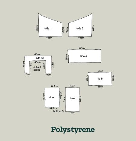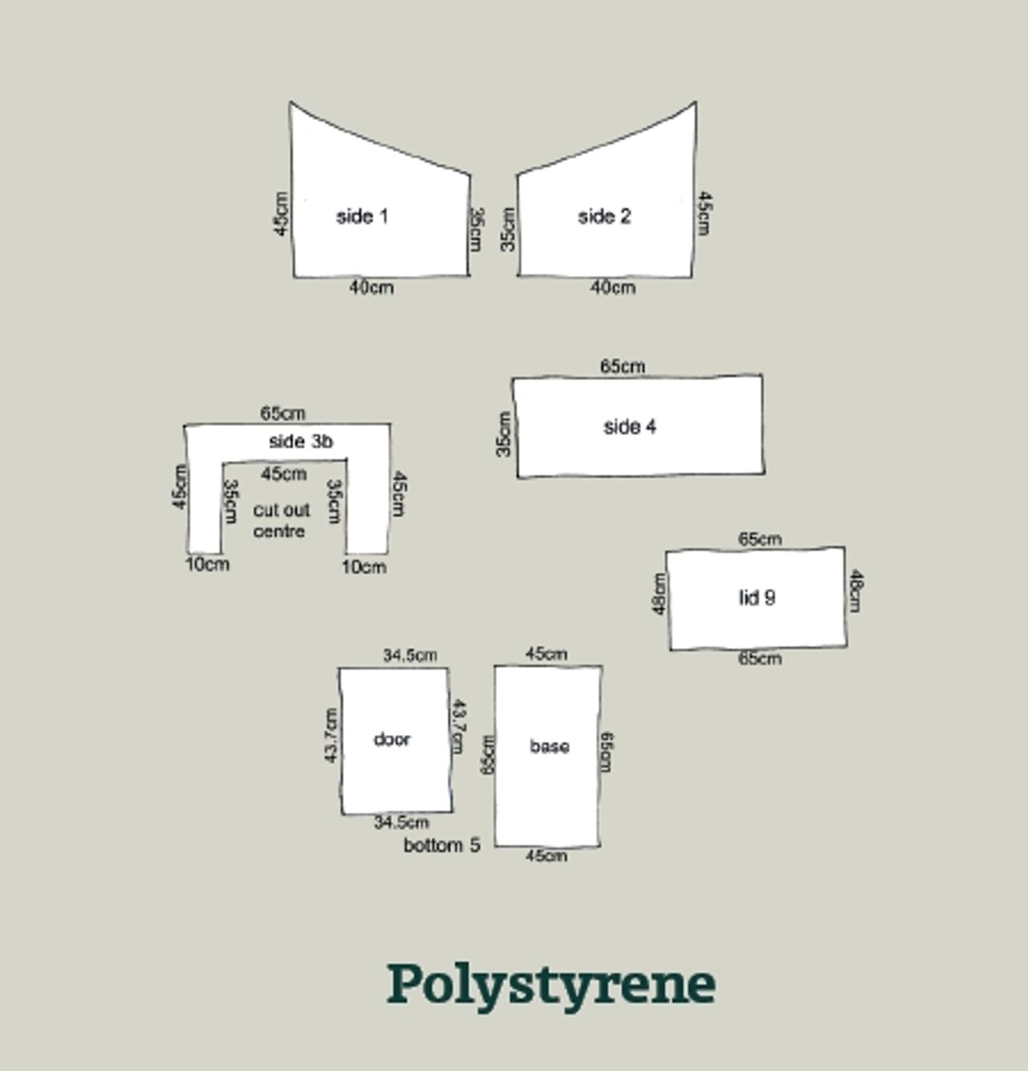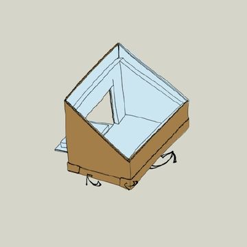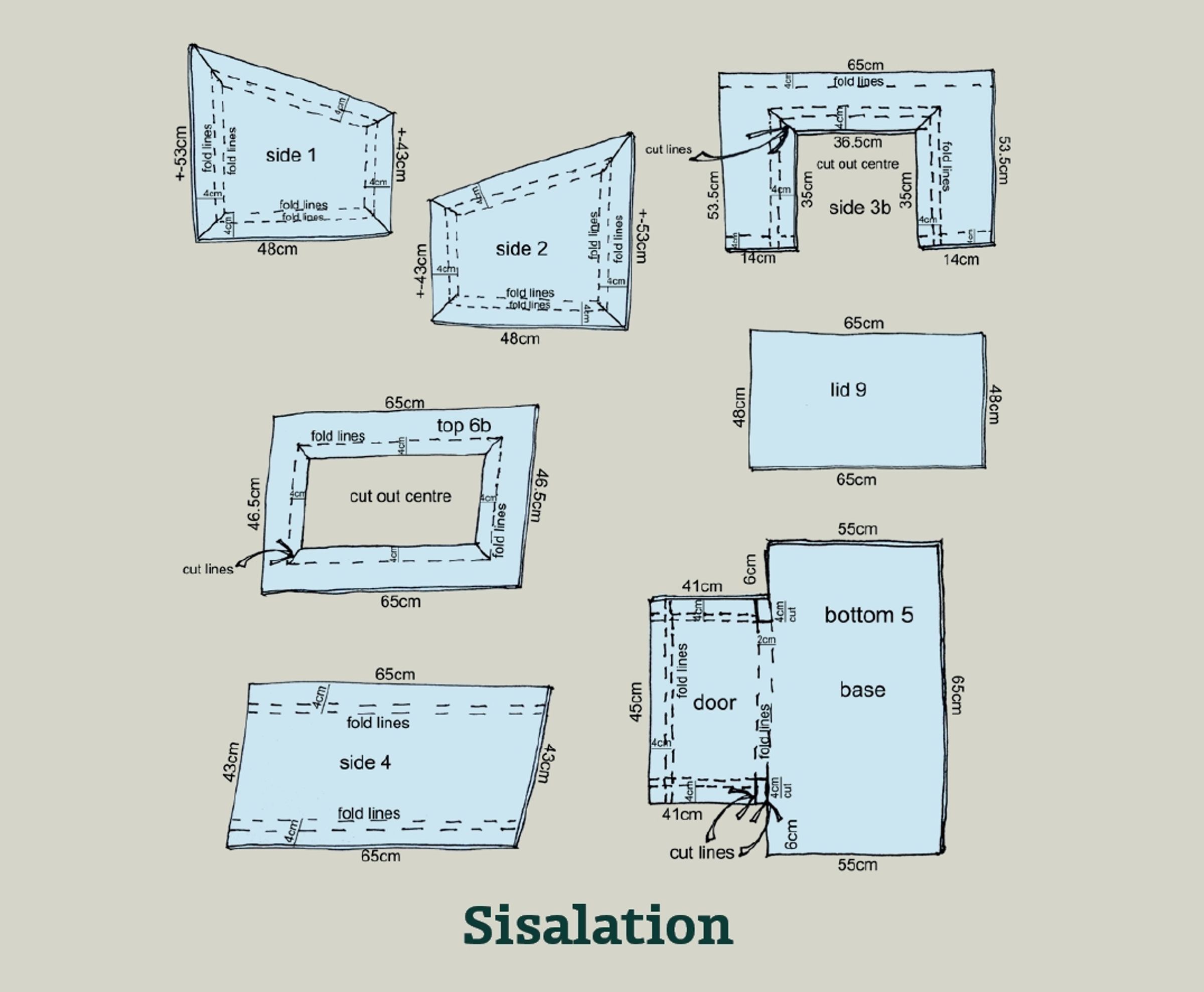 The solar oven is built from cardboard, polystyrene and sisalation. You will need to cut out shapes from all three materials using the following patterns: