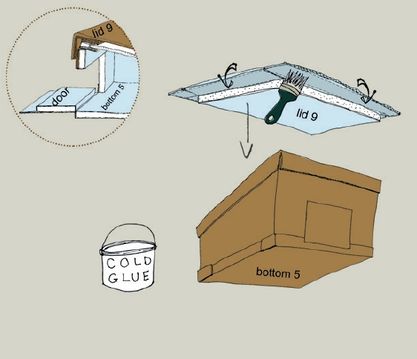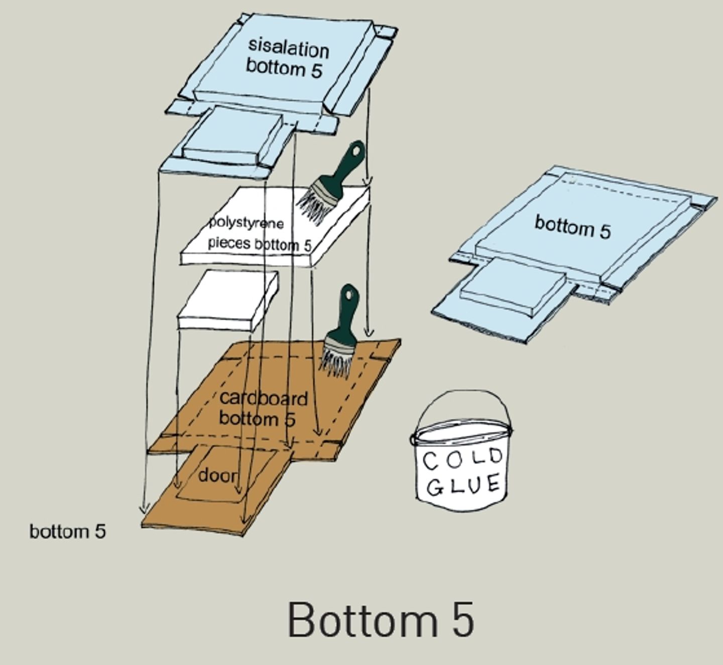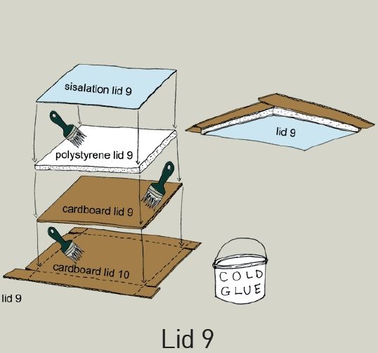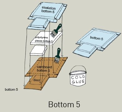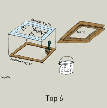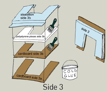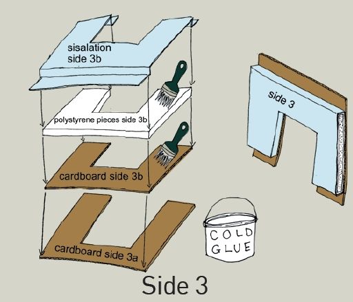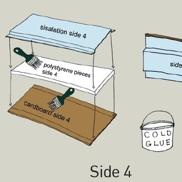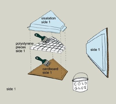 Apply glue to the cardboard and paste the polystyrene on. Apply to glue to the polystyrene and paste the sisalation on. Make sure not to glue the folding edge flaps of the sisalation and cardboard together yet