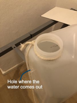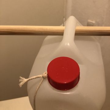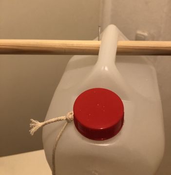 Make sure the rope is not falling on the front of the canister but on the side where you will put your pedal. Then close the lid tight. Put a nail on the rod next to the handle of the canister (on the side where the pedal is) to stabilize it.
