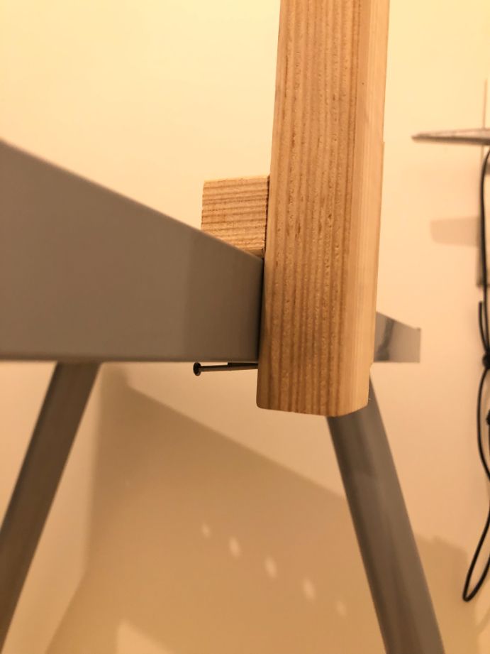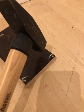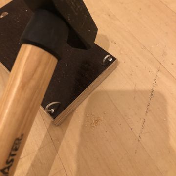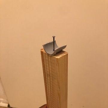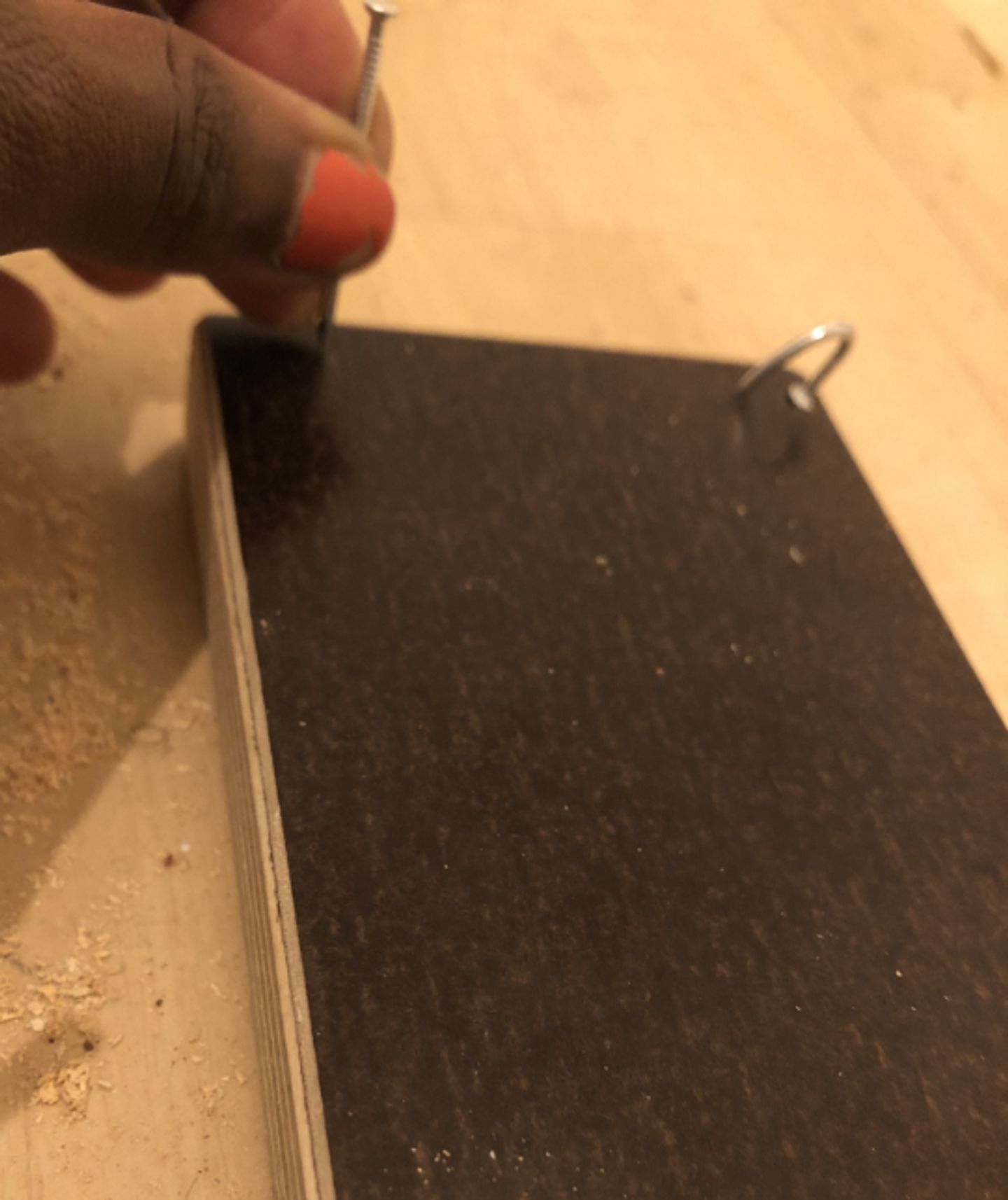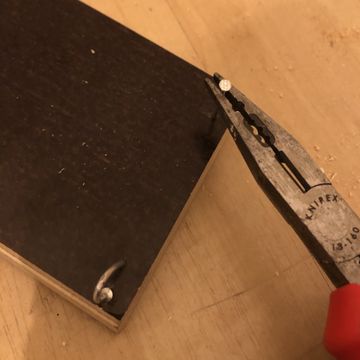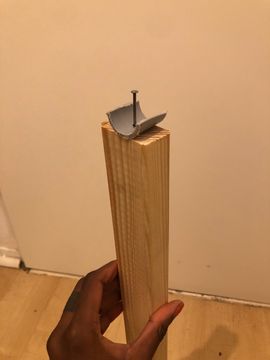 On the surface where the pedal will be fixed (make sure it’s a stable surface), hammer and bend nails just like in the previous step, but this time in a perpendicular direction. The curved nails should interlock and create a hinge.